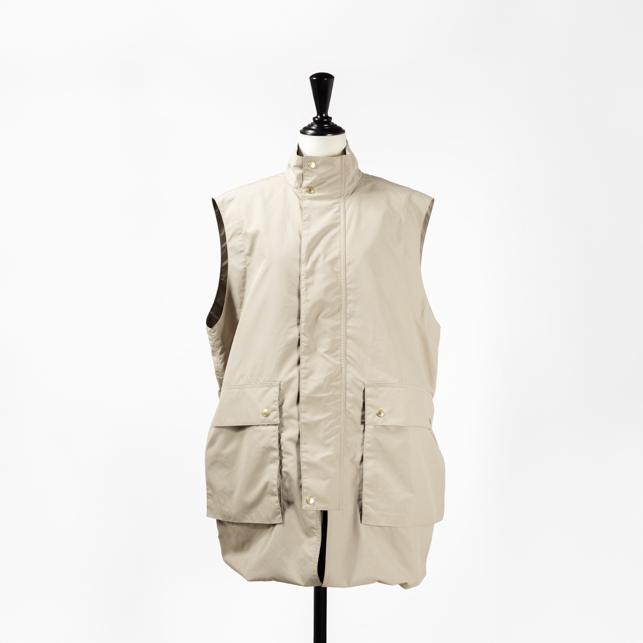 同ブランド代表するスタンドカラーコート「エルガンロング」の袖なしモデル「エルガンロングジレ」です