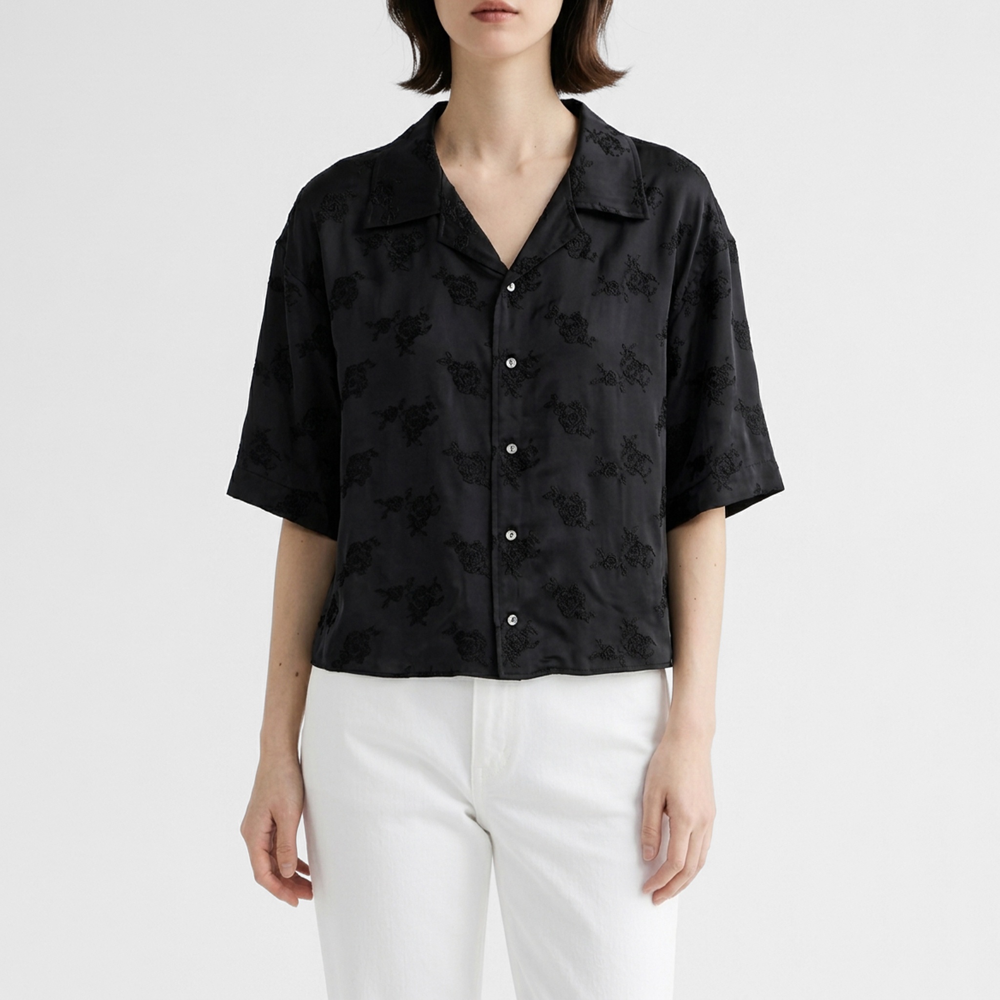 手描き風のバラ刺繍がカジュアルなシャツにモードな雰囲気をプラスし、1枚でシンプルに着こなすだけで絵になるスタイルが完成します