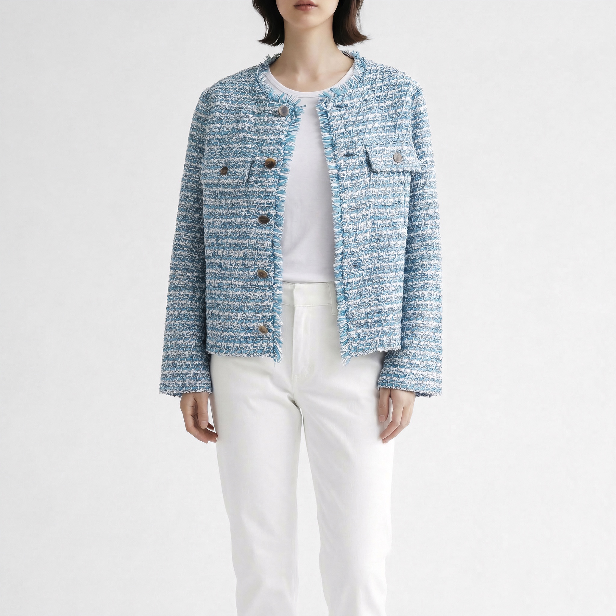 ツイードジャケットながら軽やかな着心地も魅力で、カーディガン感覚で気軽に羽織ることができます