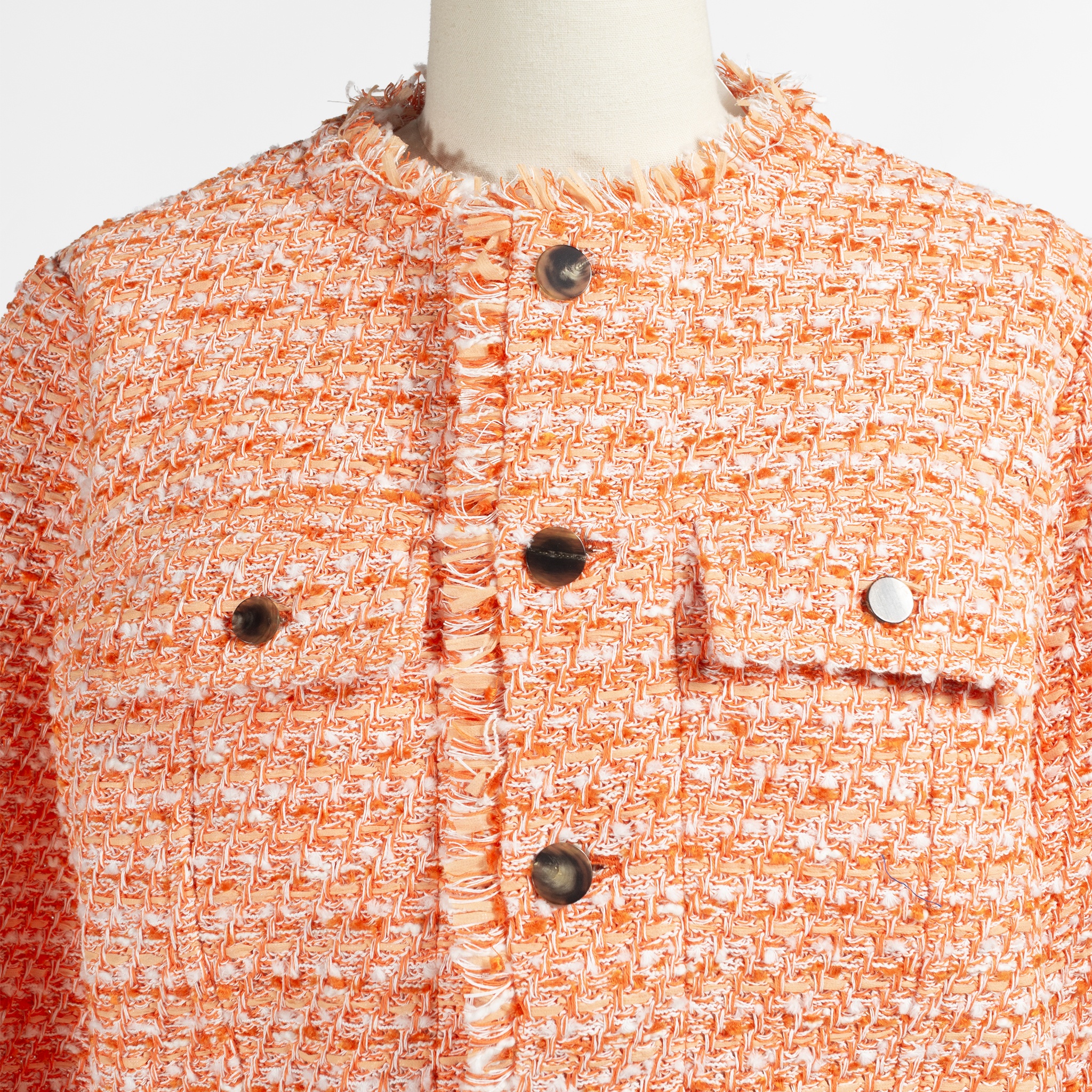 ファンシーヤーンによるニットツイードを使用したノーカラージャケットが入荷しました