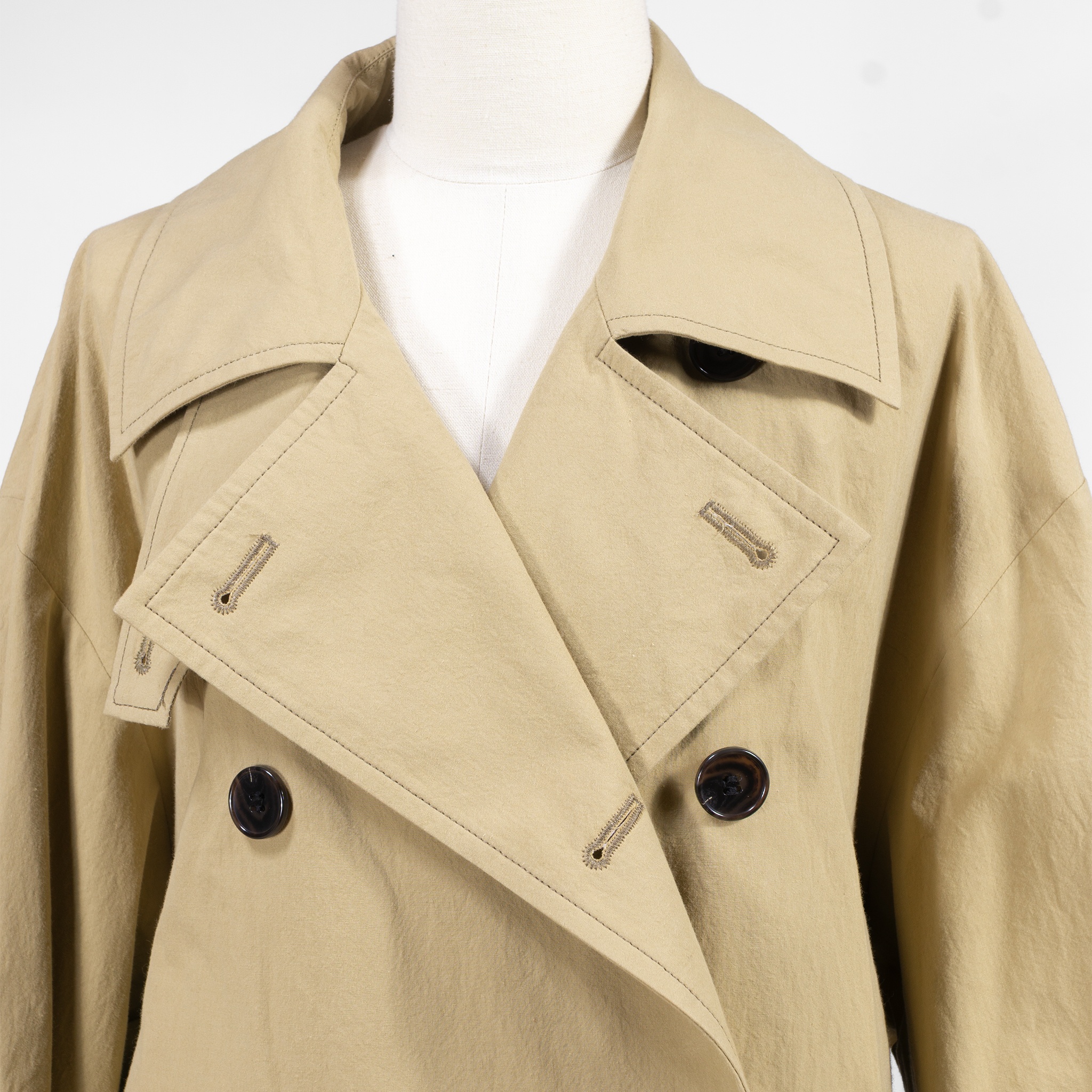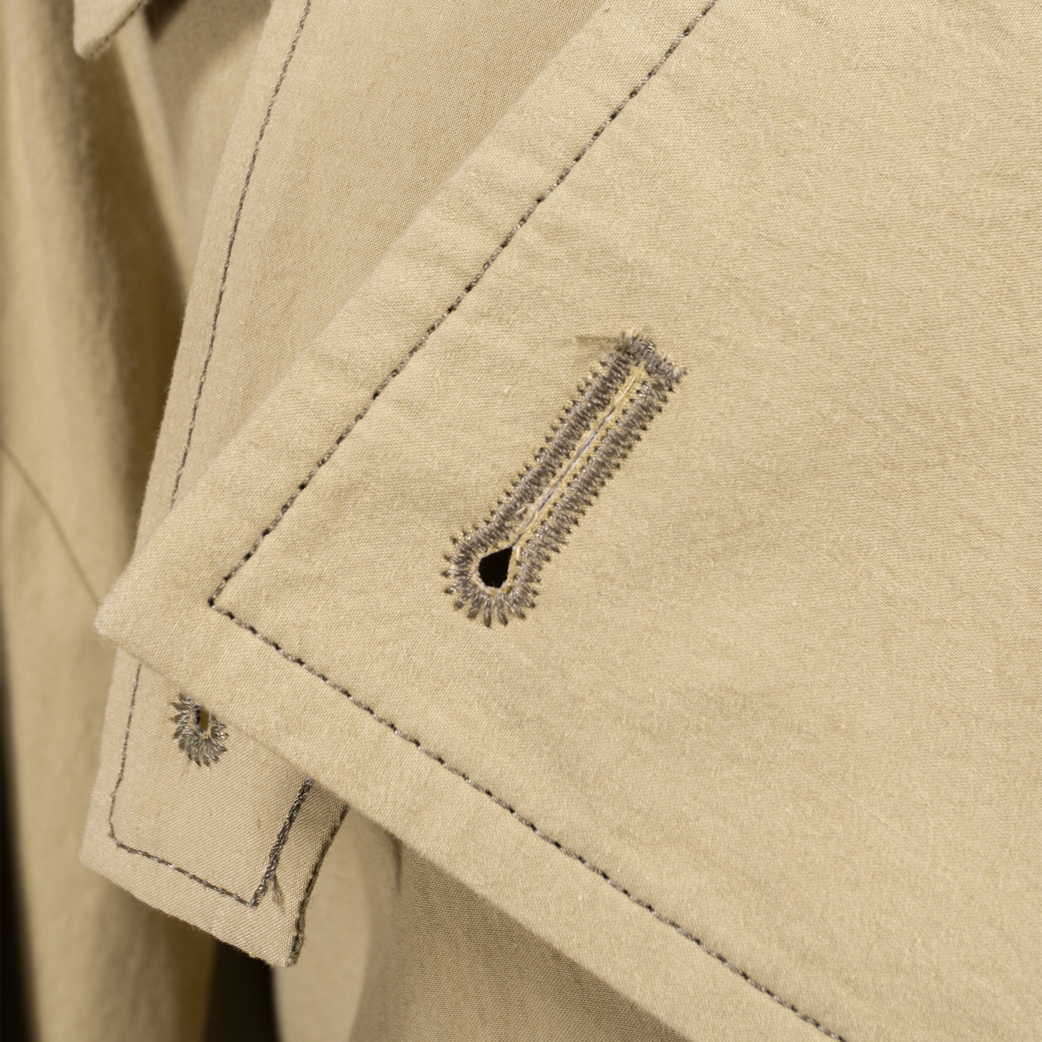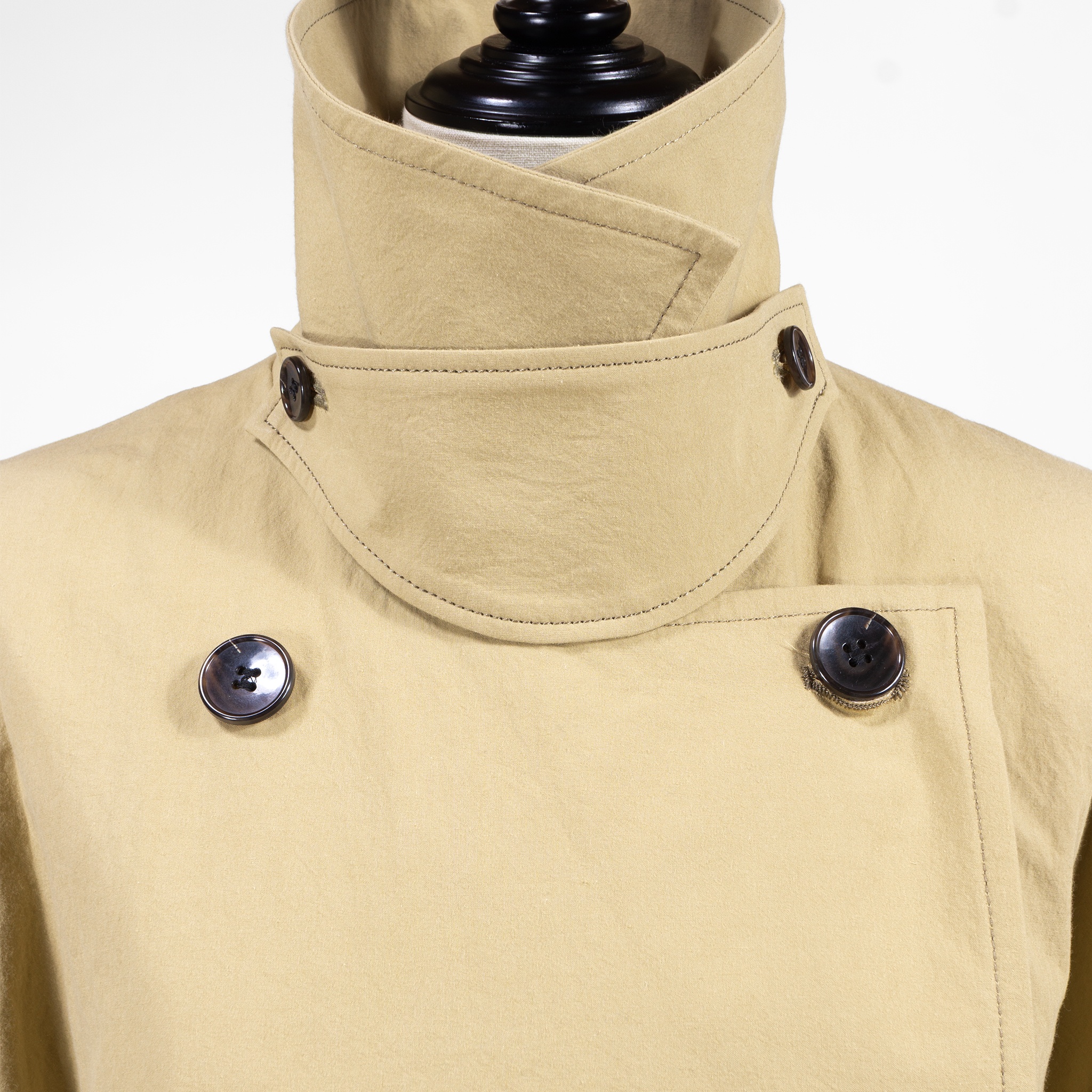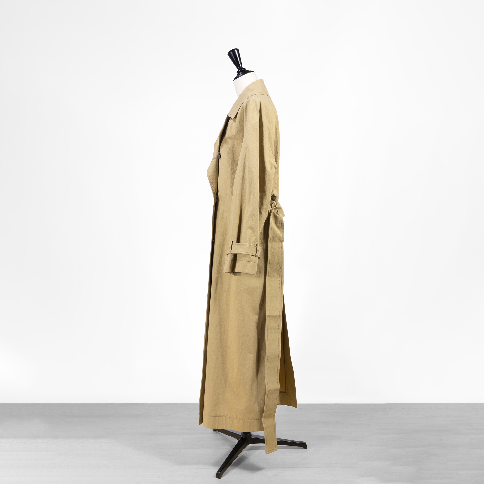 コットンダンプと呼ばれる、元々はダウンジャケットの羽毛が抜け出ないように開発された生地で仕立てられたトレンチコートです