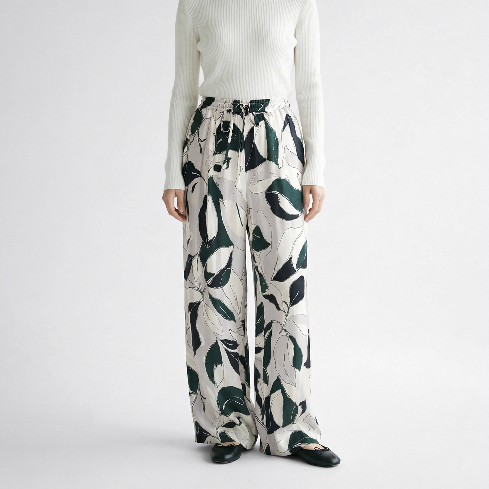 今季は、モスグリーンが品よく映える手書き風のリーフ柄