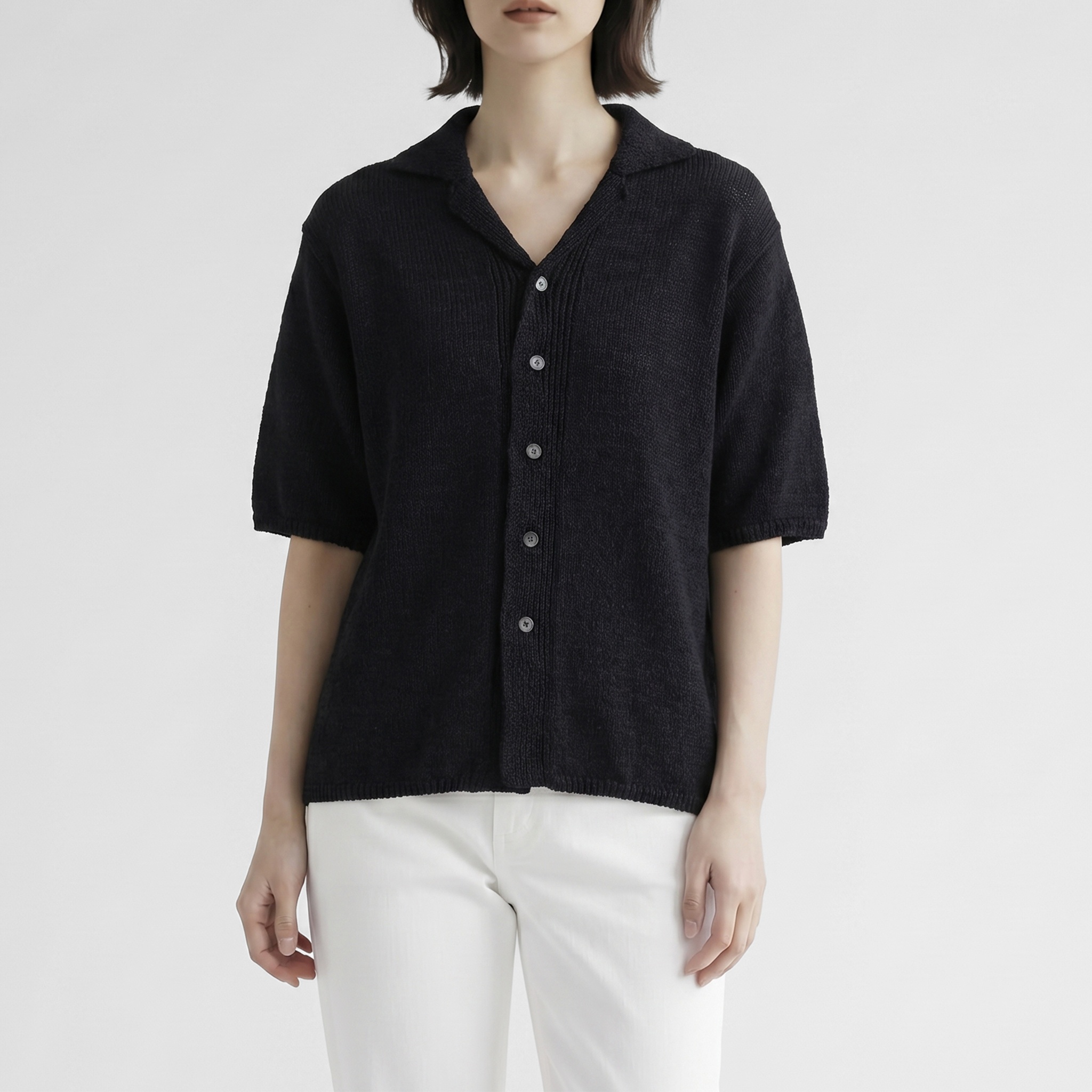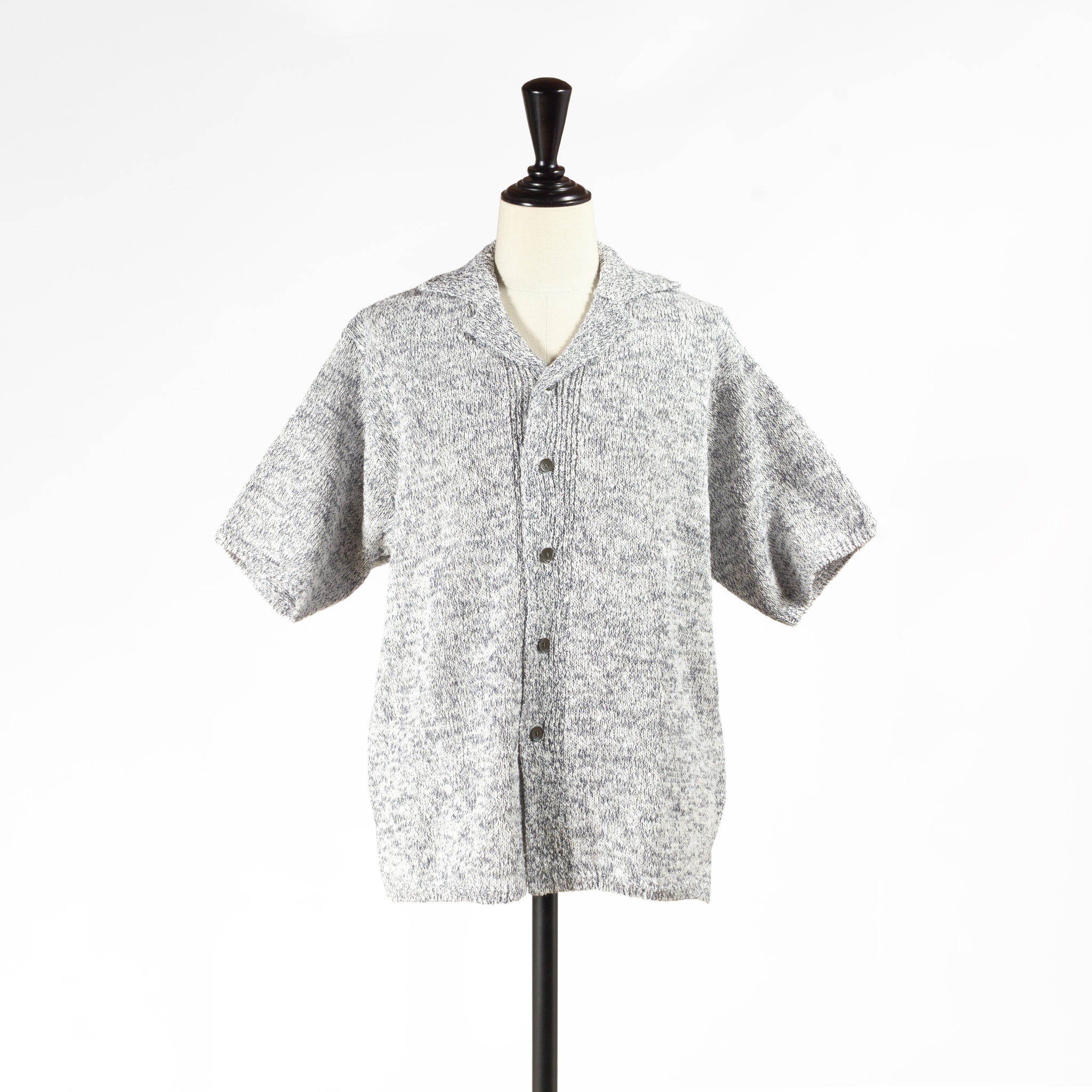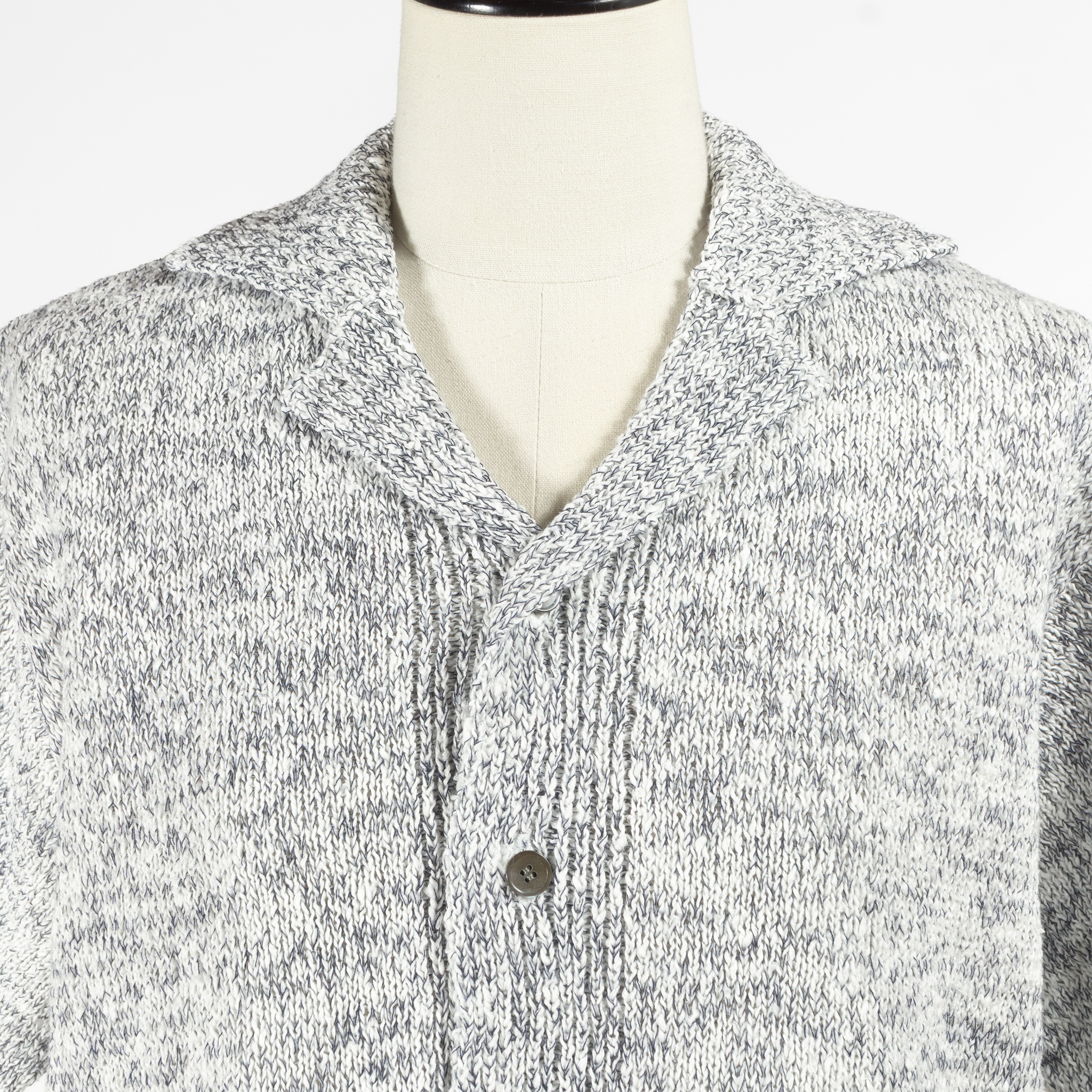 ざっくりめのローゲージ編みと程よくゆとりのあるシルエット、スッキリとした開襟で通気性に優れていて快適