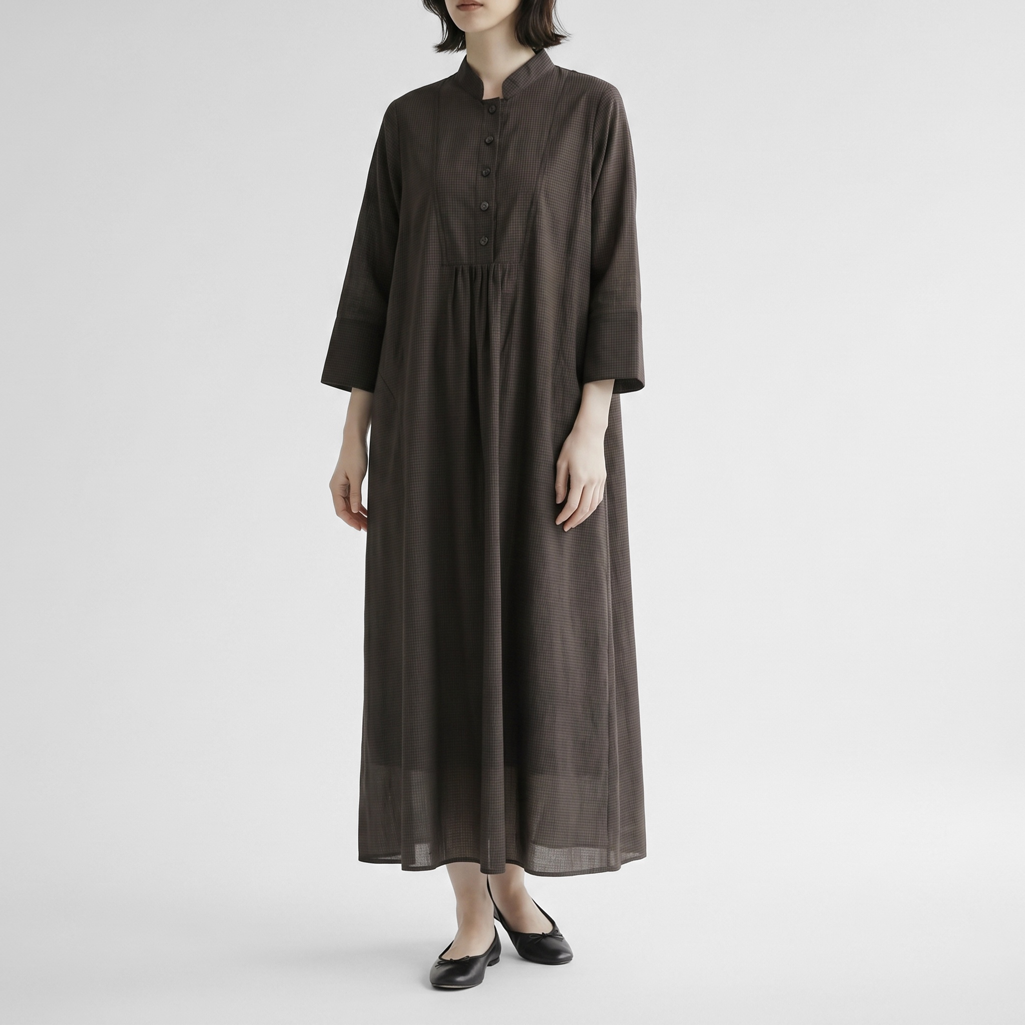 スタンドカラーとギャザーディテールが特長のサラウェアのロングセラーワンピース「Tamiyo」