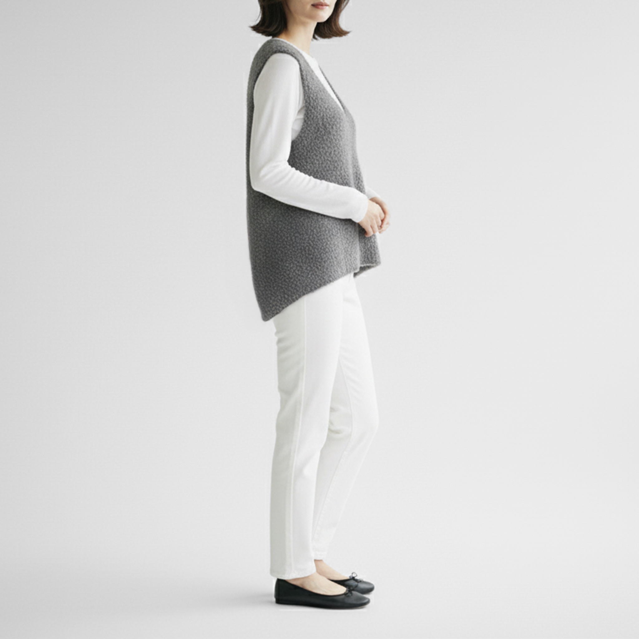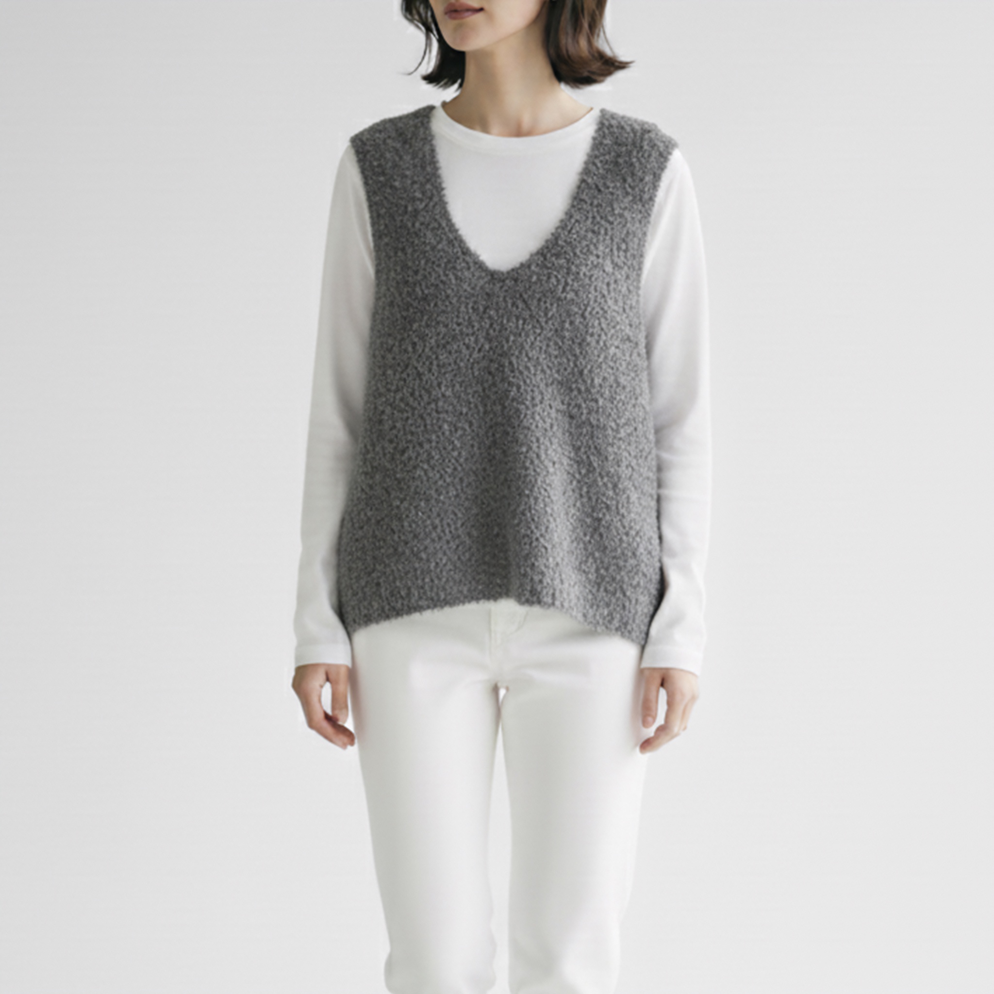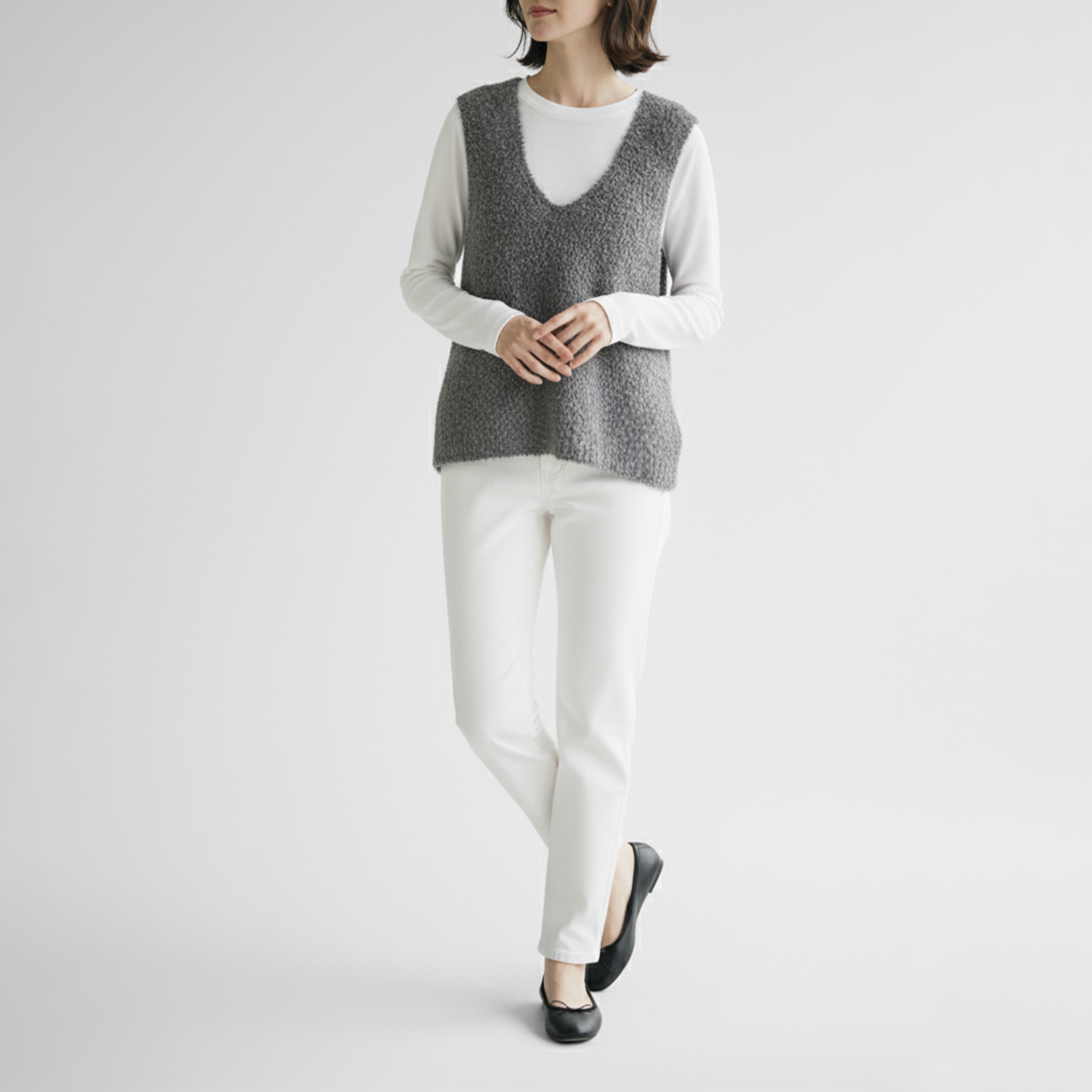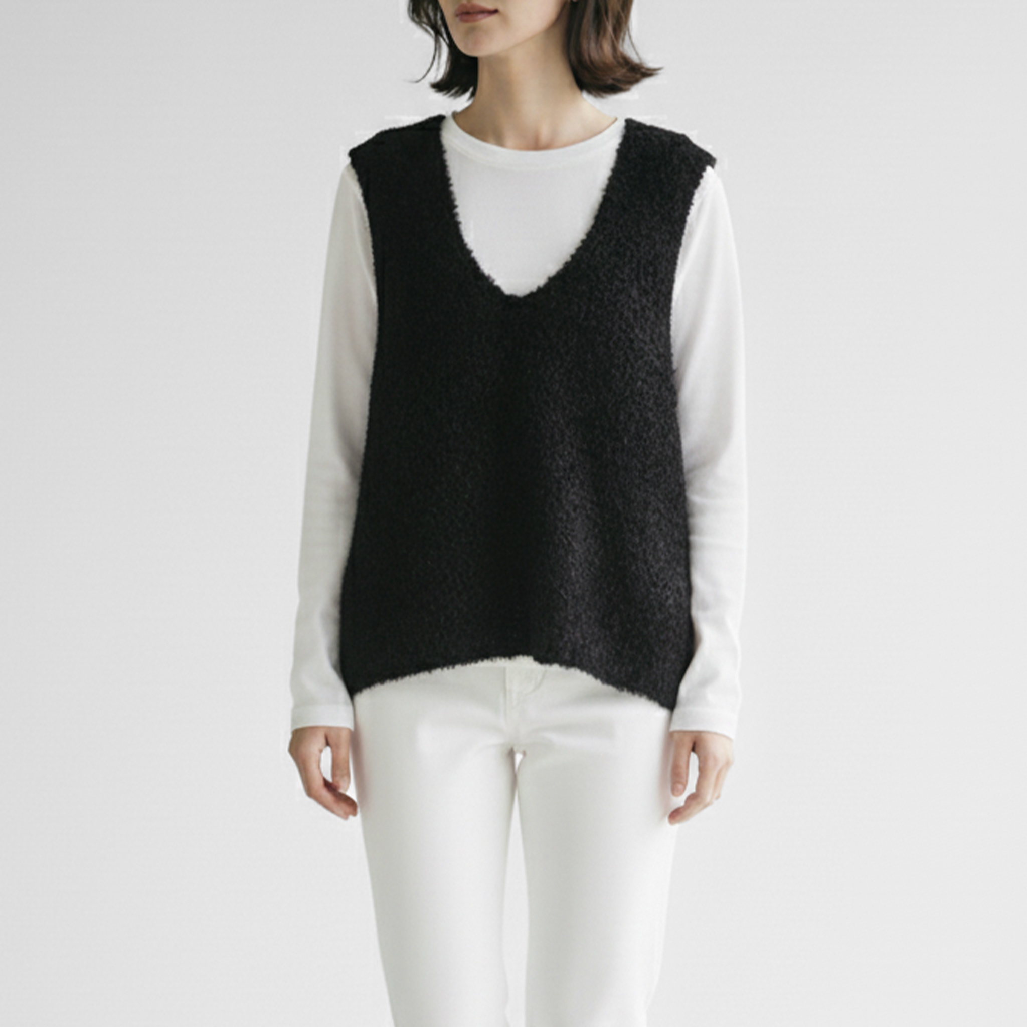 深めのVネックと広いアームホールでインナーを見せやすく、レイヤードスタイルの表現の幅をグッと広げてくれます!