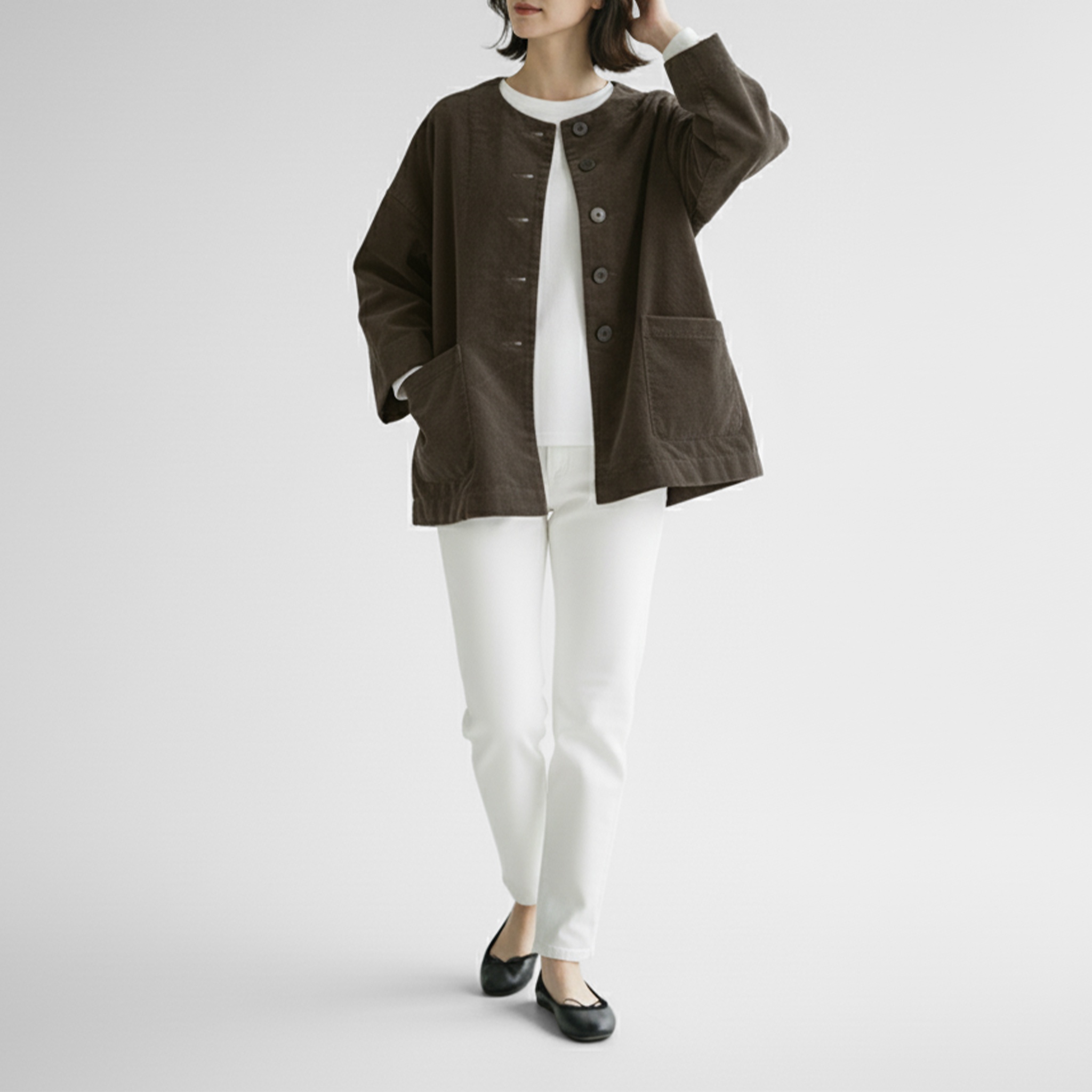 スッキリとしたノーカラーのシンプルなデザインで、幅広いコーディネートで着回せる便利な1着です!