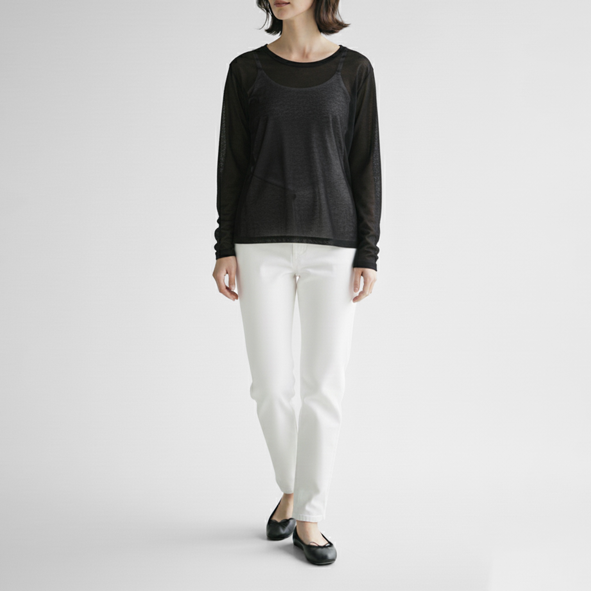 ヘルシーな透け感が大人な雰囲気で、ニットやジレ、ノースリーブワンピースやサロペットのインナーとして大活躍してくれます