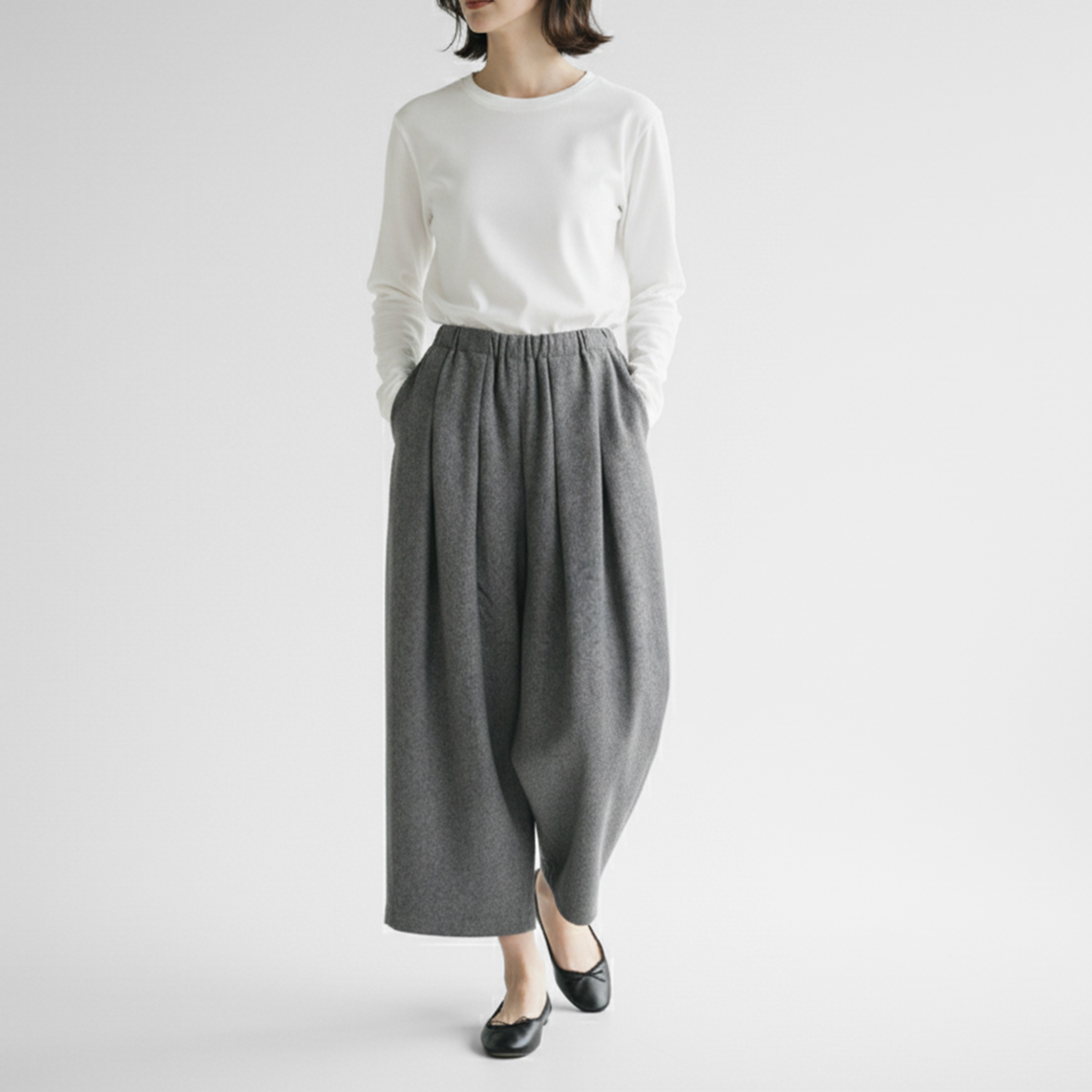 ミズイロインドから届いた新作は、寒い季節に嬉しいウール混素材を使用したワイドパンツ