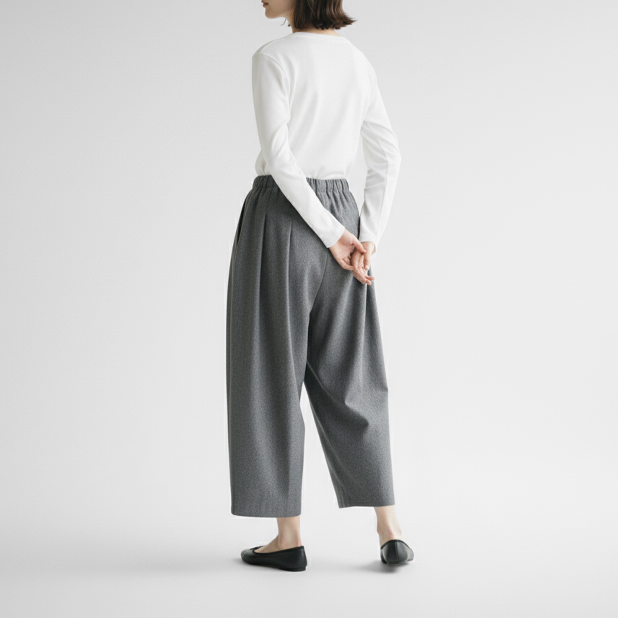 ウエストゴムのリラックスデザインながら、前後に深めのタックを入れることで上品さをプラス