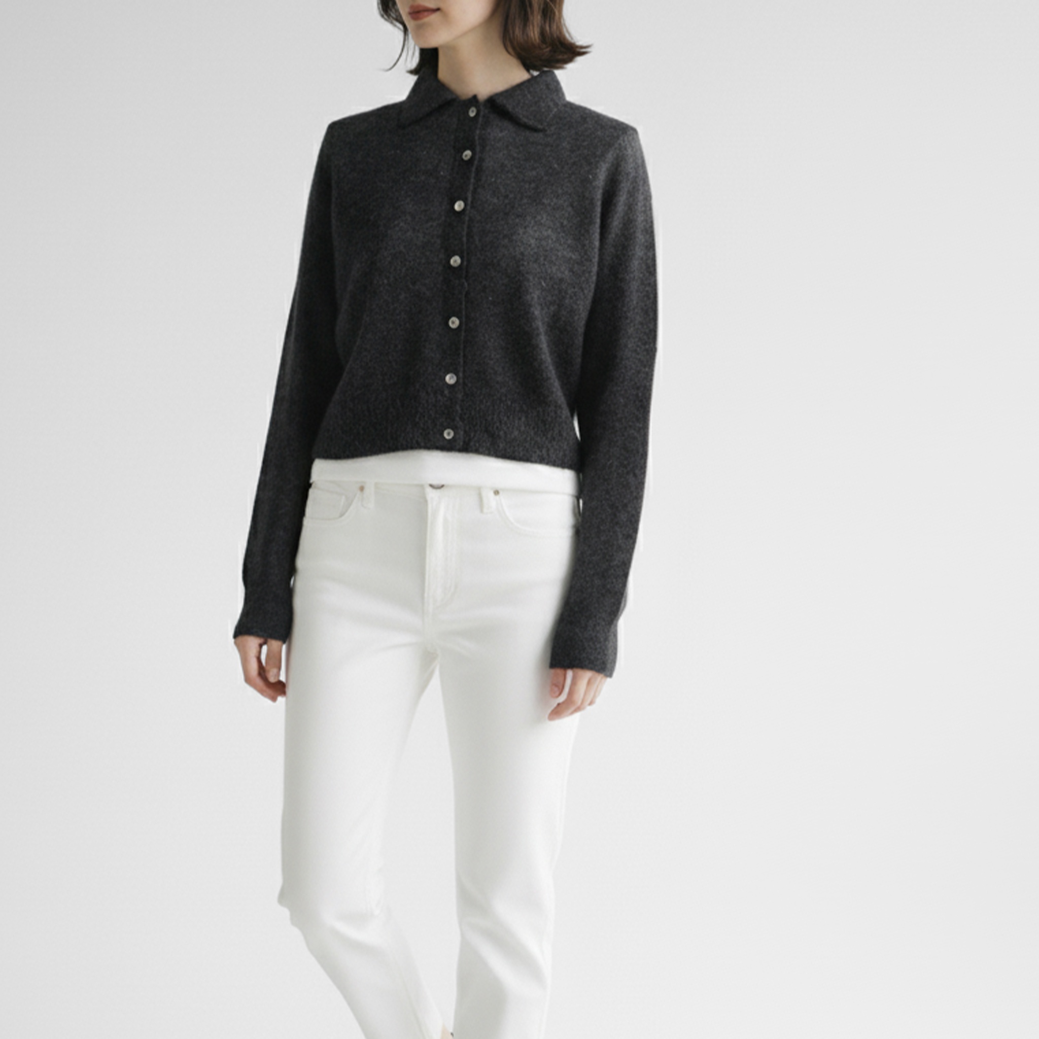 カーディガンとして羽織るのはもちろん、ボタンを留めてポロニット感覚で着るのもOK