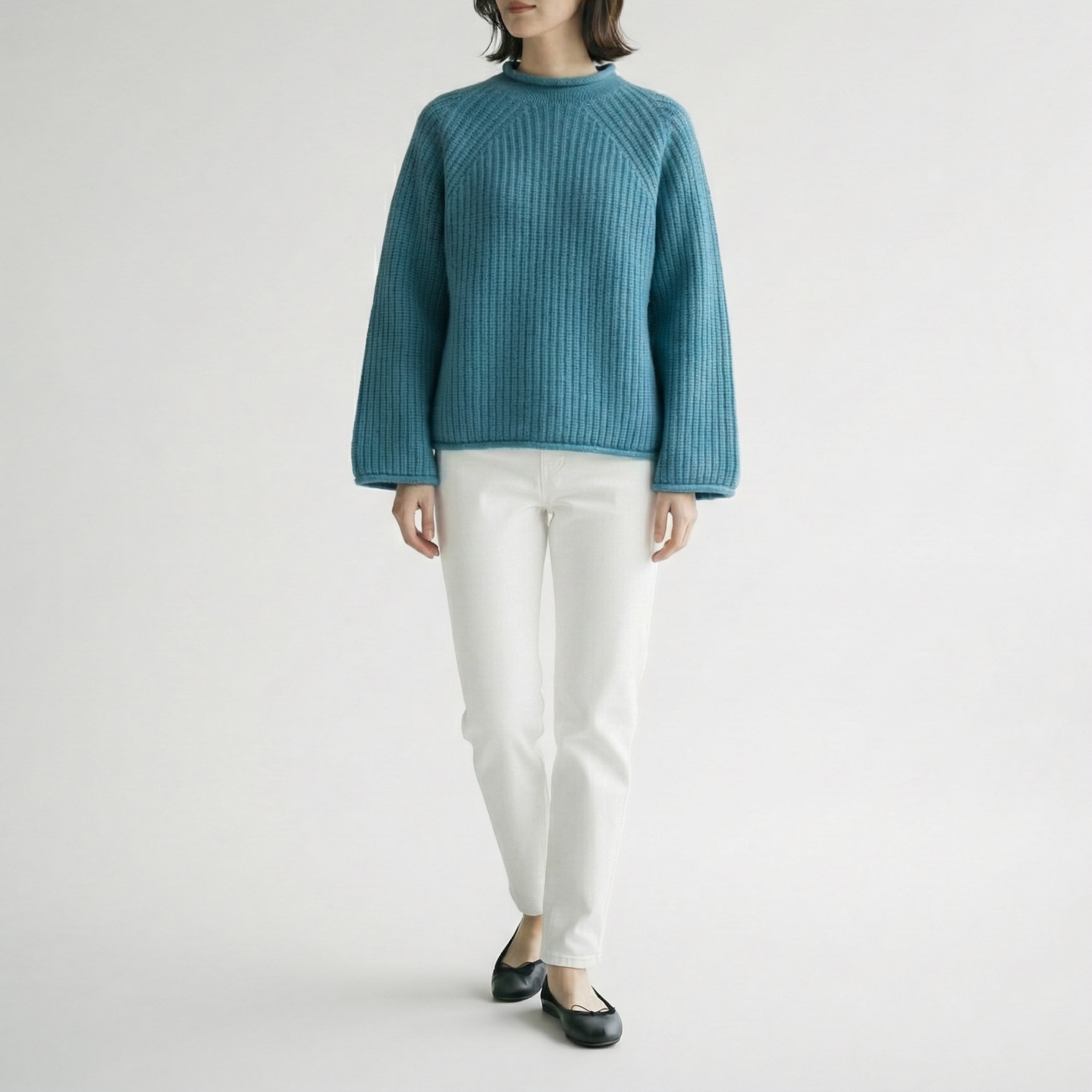 ウールにアンゴラをブレンドした上質な素材を使用し、ふんわり柔らかな肌ざわりと、ほっこりとしたウォーム感を実現