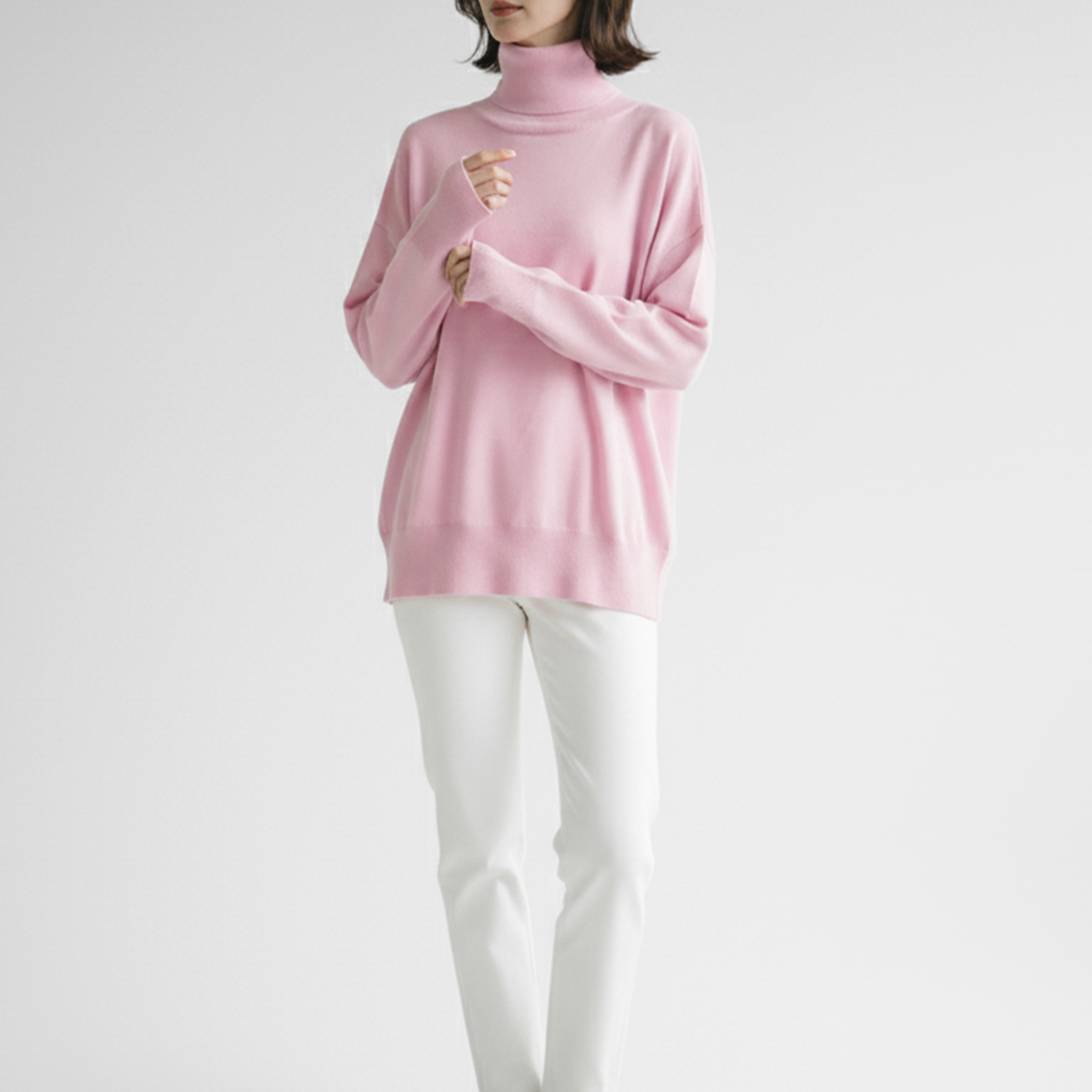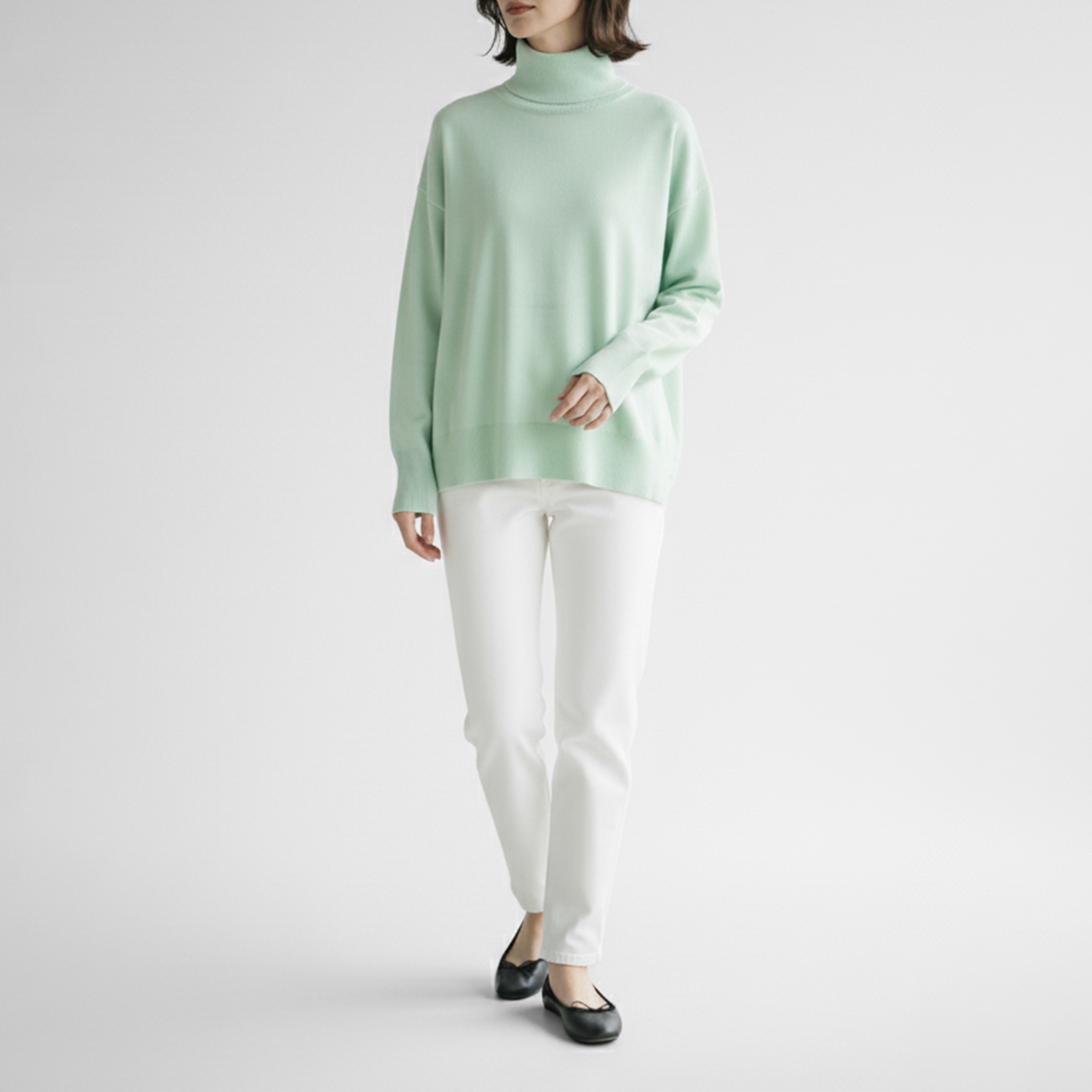 SACRAから届いた新作は、優しいペールカラーが目を惹くタートルネックニット
