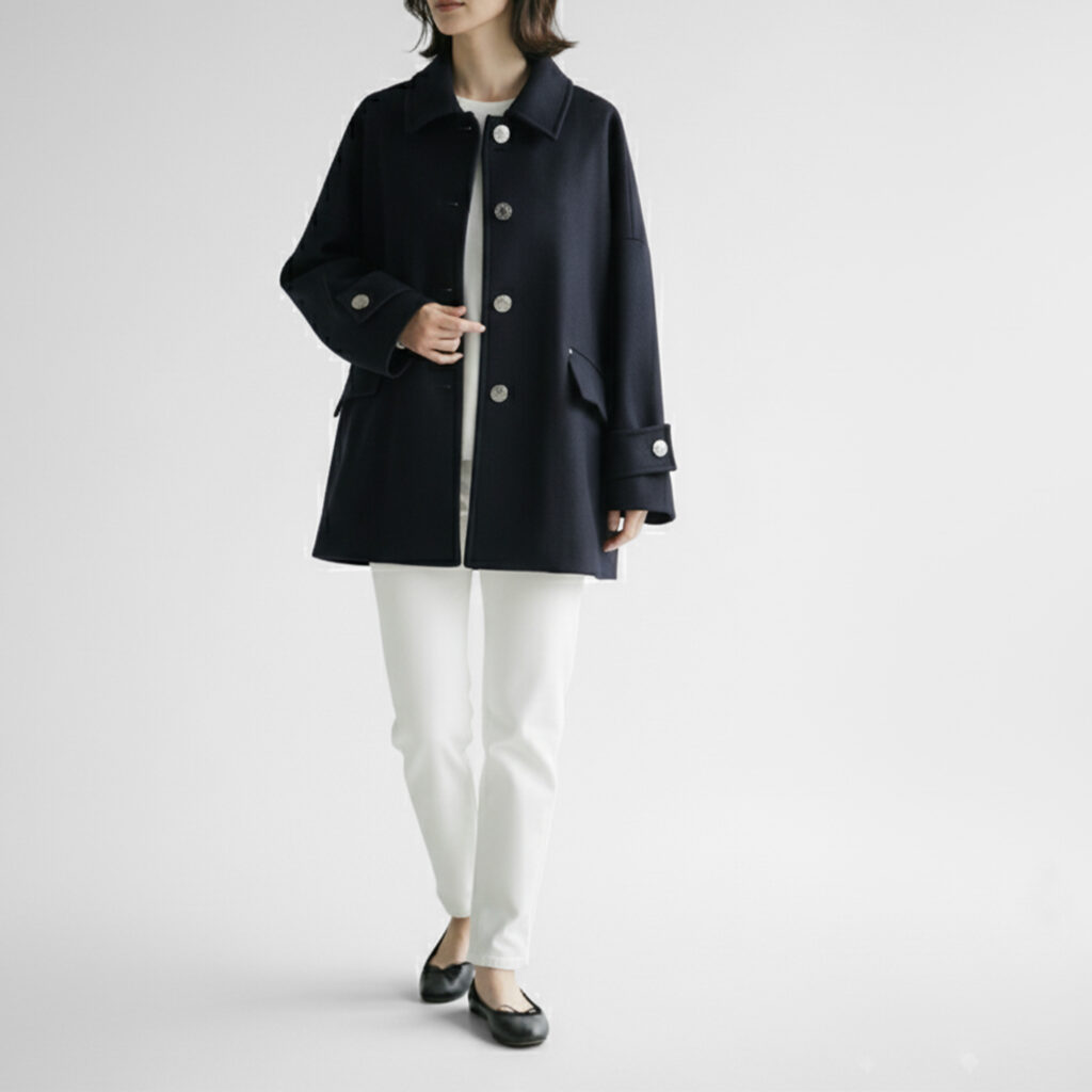 幅広のレングスに対して、ウエストはキュッとしぼってメリハリのあるフォルムを実現